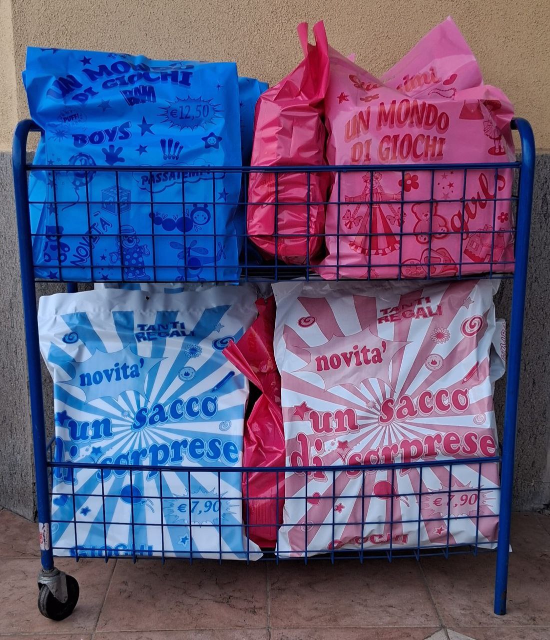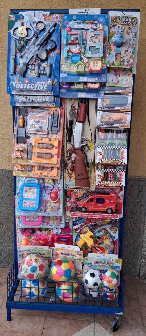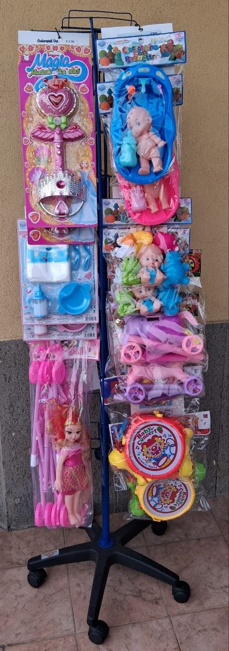 Espositore in metallo da terra con ruote 1,78 H × 0,69 L × 0,43 PEspositore da terra in metallo con ruote per palloni e buste sorpresa 0,85 H × 0,81 L × 0,40 PEspositore in metallo da terra con ruote girevole 1,70 H × 0,32 LEspositore in legno